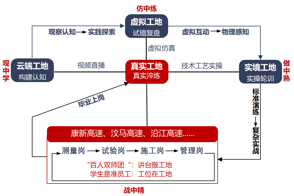 工位在工地。将实训工位搭建在工地施工现场,学生成建制、分批轮换到工地学习,以准员工的身份在测量、试验、施工等多个岗位轮岗,跨工地轮换,在真实生产链条中淬炼复合技能。