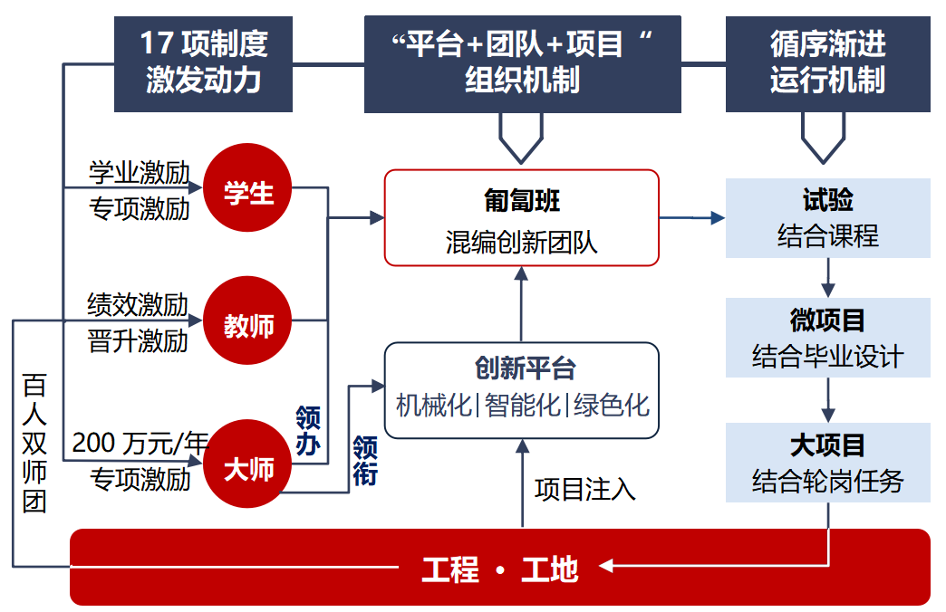 再造组织机制。依托技术创新平台,“行业大师+校内导师+工地工程师+匍匐班学生”组成混编团队。用创新平台、混编团队和科技项目,师生共同凝聚在一起,形成有组织的创新合力。