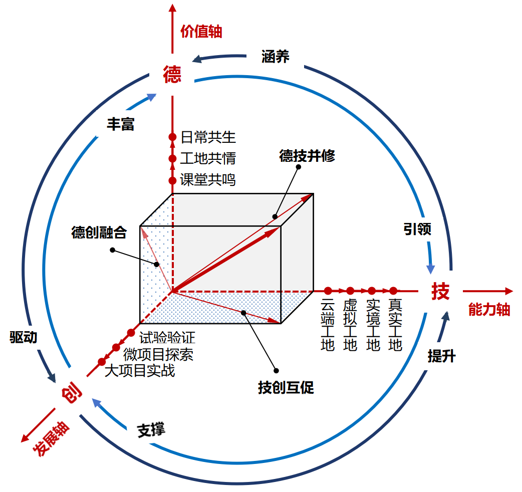 “德”引领,形成价值轴,为技能和创新厚植根基。通过“课堂共鸣、工地共情、日常共生”逐步浸润熏陶,将“甘当路石”内化为行动自觉。让学生在淬炼技能时更有韧劲,创新时拥有不竭的内驱力。