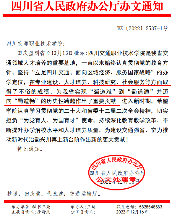 2022年12月,四川省委常委、副省长田庆盈批示“学院为我省实现‘蜀道难’到‘蜀道通’并迈向‘蜀道畅’的历史性跨越作出了重要贡献”(图11)。2024年7月,教育部原副部长吴岩听取学院汇报时,赞许学院“服务国家战略腹地,紧跟交通强国需求,培养了真正具备实战能力的技能人才”。2024年8月,教育部职业教育与成人教育司彭斌柏司长来校考察时,表扬学院“将课堂搬进工地、专业建设对接行业、主动服务国家战略”。