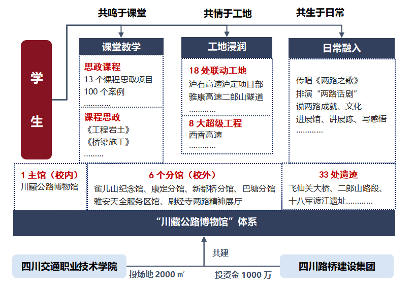 一是“路石铸魂”塑造价值。携手万亿国企蜀道集团打造川藏公路博物馆育人基地,构建“场馆浸润+工地熏陶”生动情境。推动“两路”精神进入课堂、嵌入工地、融入生活,将“甘当路石”深铸于心、践行于行。