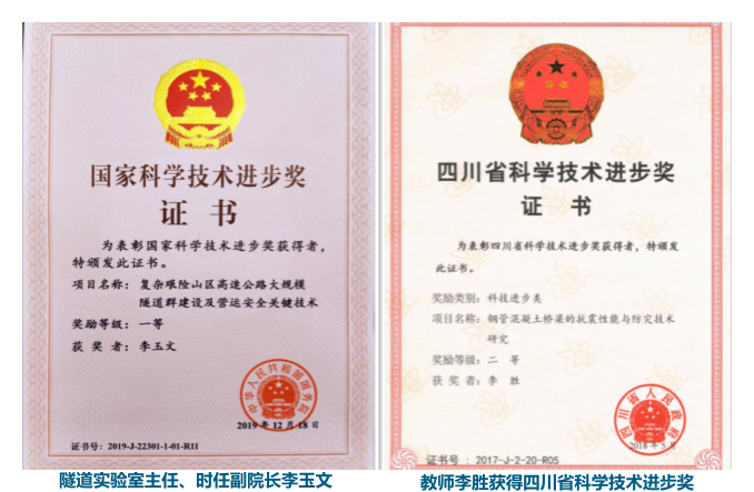 建成“长大公路隧道安全实验室”等7个省级科技创新平台,长大公路隧道安全实验室主任、时任副院长李玉文获2019年国家科技进步一等奖,李胜等连续5年获得四川省科技进步奖。教师参与的工程建设项目先后摘得“乔治・理查德森奖”“古斯塔夫林德撒尔奖”“ITA 度工程大奖”3项工程界诺贝尔奖。