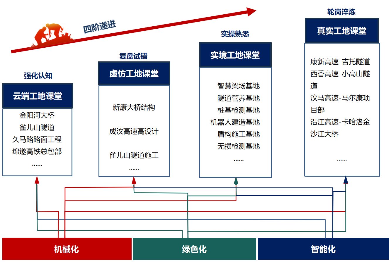 工地淬炼四阶递进:构建“认知—虚拟—实操—轮训”四阶递进培养体系。通过“直播工地课堂”观摩,建立工艺工序和理论认知。借助虚拟仿真基,实现“虚拟工地”地反复演练试错复盘;同时。在校内具有“实境工地”特征的生产性实训场景,轮训实操夯实技能。进入久马高速等18个真实工地,在不同岗位轮训,跨工地历练,锻造复合技能。